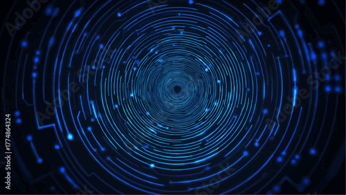 Circular pattern with blue glowing lines and dots creating a tunnel effect on dark background