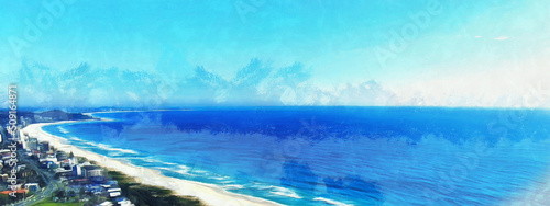 City near ocean beach, scenic landscape