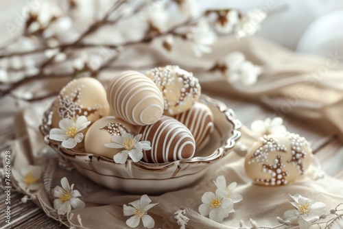 Classy arrangement of chocolate Easter eggs adorned with flowers in a bowl on a wooden table