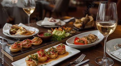 Classy arrangement of tapas and appetizers with wine glasses for guest dining