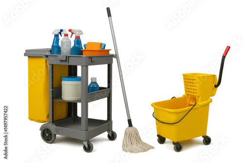 Cleaning cart with supplies, mop bucket, and cleaning equipment on transparent background