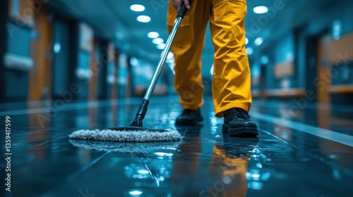 Cleaning Professional Mopping Gleaming Floor in Modern Building