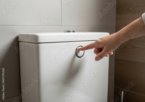 Close up of a hand pressing the flush button on a modern toilet cistern