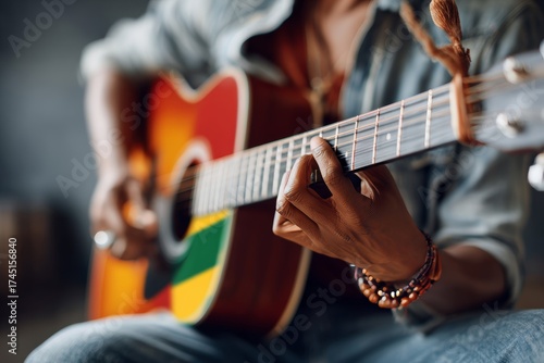 Close up of acoustic guitar with Brazilian flag decoration, showcasing vibrant colors and intricate details, highlighting musical artistry and cultural expression
