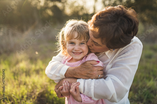 Close up of grandma hugging granddaughter from behind, kissing cheek