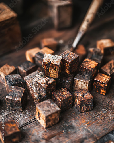 Close up of raw wooden blocks and chisel on rustic wooden surface, showcasing craftsmanship and natural textures