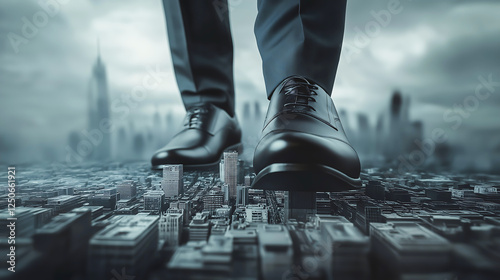 Close up of the legs and shoes a businessman stepping on a tiny city below. Control and authority concept