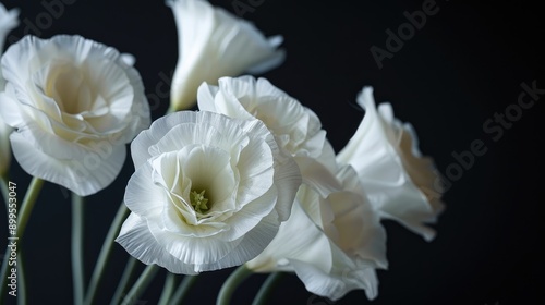 Close up of white eustomas on black backdrop