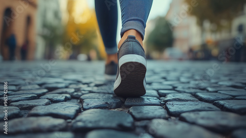 Close up of woman foot stepping onto cobblestone street in casual urban setting capturing the motion and texture of the path