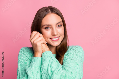 Close up photo of attractive person arms folded on cheek wear teal sweater isolated on pastel pink color background