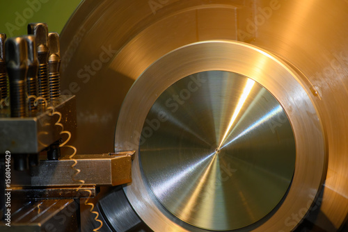 Close up scene the lathe machine rough cutting the brass material parts by chip insert tool.