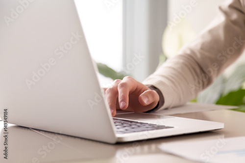 Close up view of male hand typing on laptop keyboard, businessman working on personal notebook computer at the office desk, browsing web, programming, office worker using pc at workplace