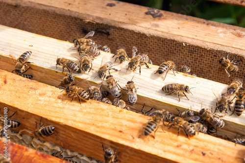 Close up view of the bees swarming on a honeycomb..