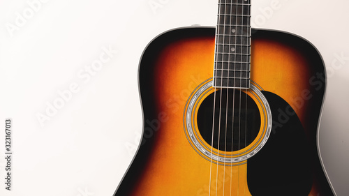 Close-up acoustic guitar on white wall background, vintage filter.