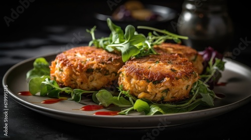 Closeup Maryland Crab cakes with chopped greens on a wooden plate with a blurred background