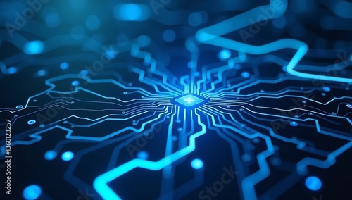 close-up of a glowing circuit board with intricate pathways and bright, electric blue light emanating from the connections