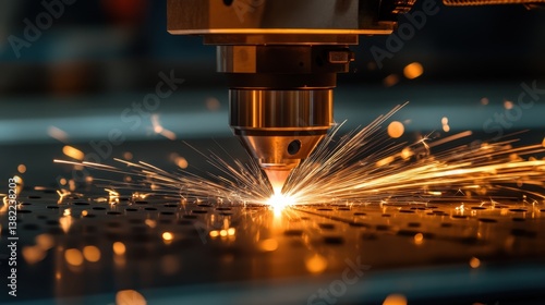Close-up of a high-powered laser cutting through metal, sparks flying in all directions, creating a dramatic effect