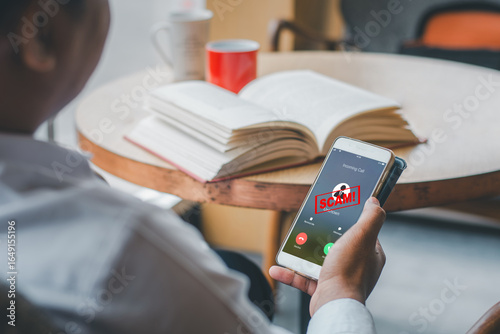 Close-up of a man holding a smartphone displaying a scam call warning while sitting at a table with an open book and coffee cup.