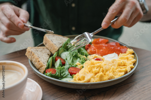 Close-up of a man sitting at a cafe eating a smoked salmon scrambled egg, salad and toast breakfast with a latte coffee
