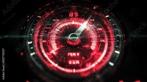 Close-up of a red illuminated speedometer displaying futuristic technology, highlighting precision and motion with dynamic lighting effects.