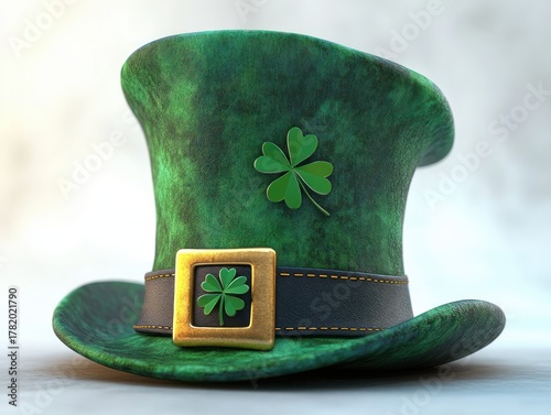 Close-up of a textured green top hat with a black leather band featuring a golden buckle and four-leaf clover decorations on the hat and buckle