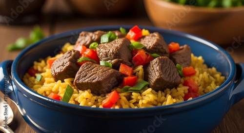 Close-up of a vibrant dish in a blue bowl with rice, meat, peppers, and scallions