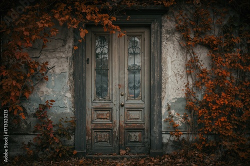 Close-up of a vintage doorway and window with autumn hues and colorful paint