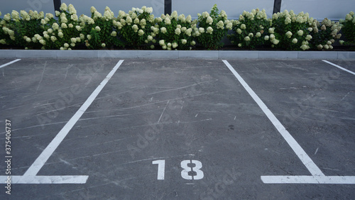 Close-up of a white paint number marking in a parking lot. Empty parking lot, Parking lot with white mark, Open parking in public park. Number 18.