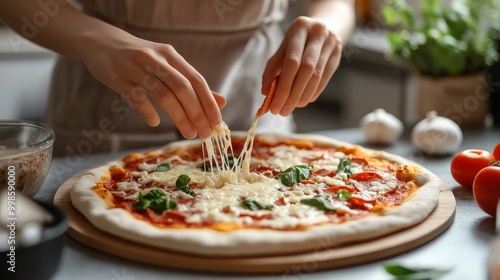 Close-up of a woman spreading cheese on pizza at a gray table