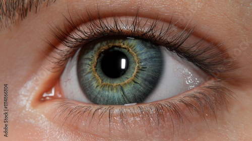 Close-up of a woman's beautiful green eye with visible details of iris, pupil, and eyelashes.