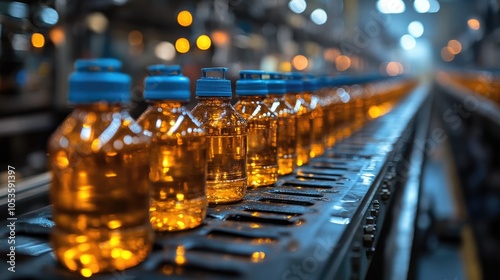 Close-up of amber liquid filled plastic bottles moving on a factory conveyor belt