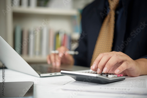 Close-up of an accountant's hands using a calculator to calculate tax or financial budget on a wooden desk with a laptop and documents.