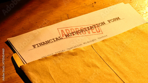 Close-up of an approved financial authorisation form nestled within a brown envelope