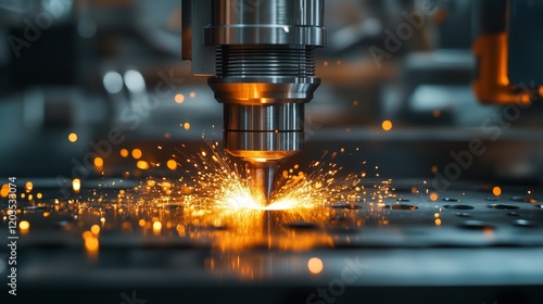 Close-up of an industrial machine performing laser cutting on metal, emitting sparks as it processes the material with high precision, symbolizing modern technology, efficiency and manufacturing