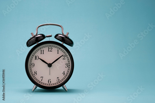 closeup of beautiful black alarm clock on green background wit copy space.