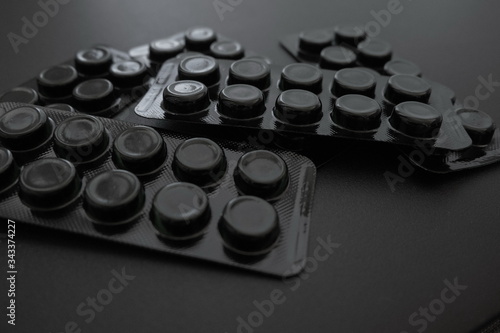 close-up of black pills activated carbon (Activated Charcoal) in packaging on a black background