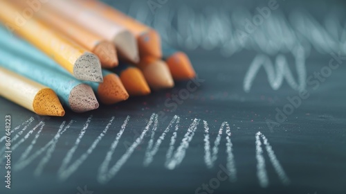 Close-up of colorful pencils on a chalkboard with white chalk lines. Perfect for education, creativity, and school-related themes.