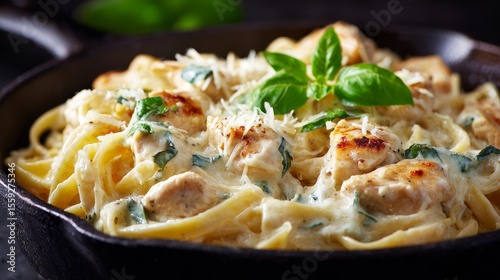 Close-up of creamy chicken Alfredo pasta garnished with basil and cheese in a skillet