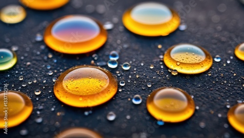 Close-up of golden droplets on a textured surface, showcasing water and oil interactions.
