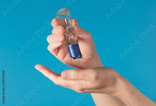 Closeup of hands using hand sanitiser gel against a blue background