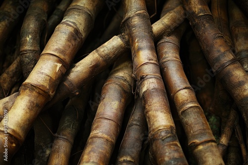 Close-up of intertwining bamboo stalks, showing textured surface and natural patterns.