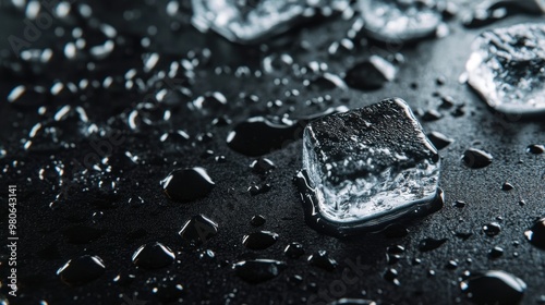 Close-up of melting ice cubes on a reflective black surface, with small droplets of water forming pools around them.
