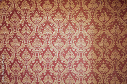 Close-up of ornate historic style damask wallpaper in gold and red tones, suitable as a decorative background.