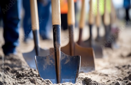 Close-up of shovels lined up for a ground-breaking ceremony, with a blurred background of people ready to start a construction project. Ample space for text overlay.