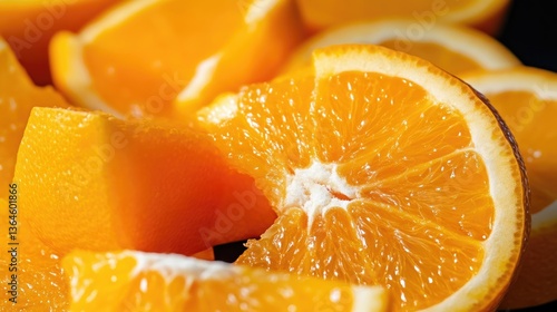 Close-up of sliced oranges. Fresh, juicy segments are displayed, showcasing the vibrant orange color and the internal structure