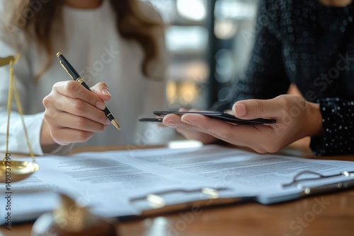 Close-up of two people reviewing documents with a pen and holding credit cards at a wooden table with a small brass scale in the background