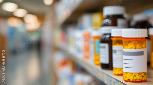 Close-up perspective, rows of amber and white pill bottles perfectly aligned, labels facing forward, blurred background emphasizing pharmaceutical order and efficiency