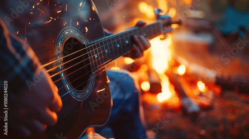 Close-up photo of a person playing guitar by the warmth of a campfire