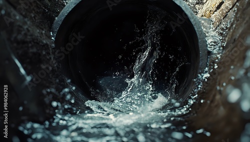 Close-up shot of water rushing through a pipe, creating a splash and spray effect.