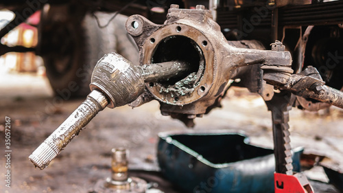 Closeup the right front wheel hub of the car for replacement and repair.